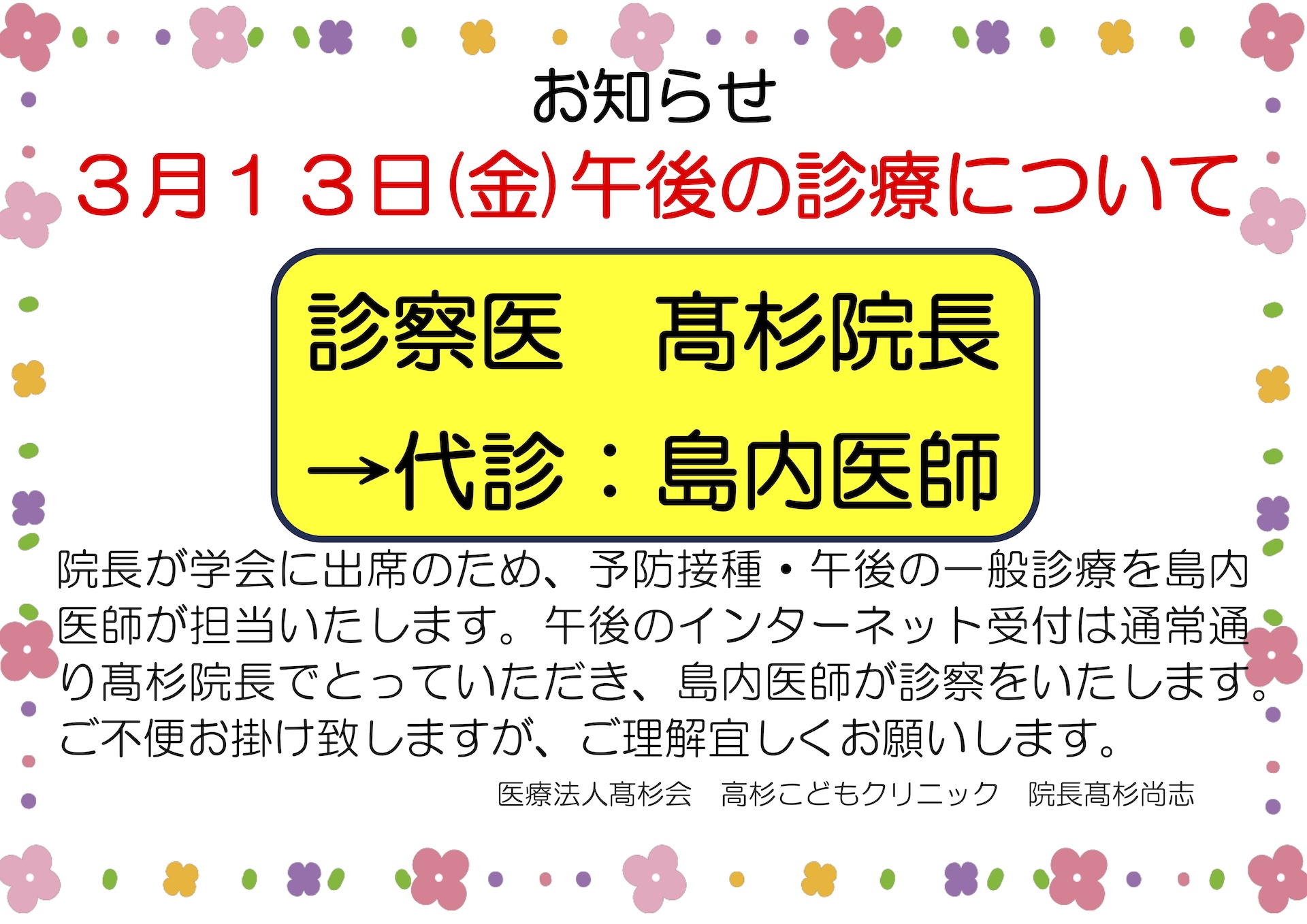 診察医:髙杉院長→代診:島内医師